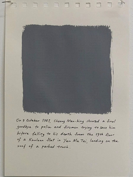 | On 9 October 1987, Cheung Man-hing shouted a final goodbye to police and firefighters trying to save him before falling to his death from the 19th floor of a Kowloon flat in Yau Ma Tei, landing on the roof of a parked lorry. | |