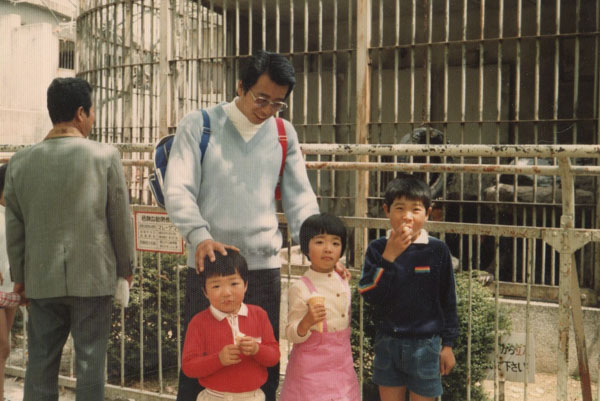 | Visiting Tokuyama Zoo. C-print, C.1982, 8 x 12 cm, Daisuke Tao Collection. Tokuyama Zoo is a tourist attraction in Yamaguchi Prefecture. Mr. Daisuke’s father took him to visit with his sister and their cousin on his day off. The man wearing a grey jacket in the back is a postman from Shunan City. His daughter, who is in elementary school, loves the Malay Bear in the zoo and wants to become a zookeeper. They had also come for the female Jaguar named Jammy that had recently arrived from Fukuoka Zoo. What he couldn’t know was that many years later his daughter would have the opportunity to “interview” the now very popular Malay Bear, Tsuyoshi, when she worked for a television station. The bear had become famous for holding its head like some people do when they are in deep trouble. |