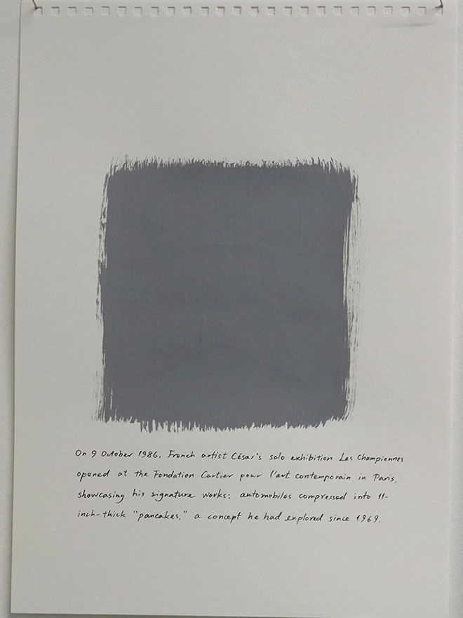 | On 9 October 1986, French artist César’s solo exhibition Les Championnes opened at the Fondation Cartier pour l'art contemporain, showcasing his signature works: automobiles compressed into 11-inch-thick “pancakes,” a concept he had explored since 1959. | |