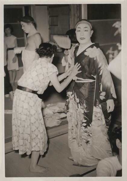 | Dressing for Brides’ Parade. Gelatin silver print, 1955, 11.4 x 8 cm, Fujita Cosmetics Collection. Founded in 1956, the now famous Tanabata Festival of the Endoji neighbourhood was previously known as the “Brides’ Parade” (Hanayome Gyouretsu). In its predecessor as part of the celebration, all the male participants dressed as brides. In this photo we see an amusing moment where Mr. Mitsutaka Fujita shows his pride at “becoming” a woman, while the woman who helps him dress tries to hide from the camera. She was 35 and not yet married. Though cheerful and active in the community, she had become embarrassed about being photographed as she herself was not yet a bride. |