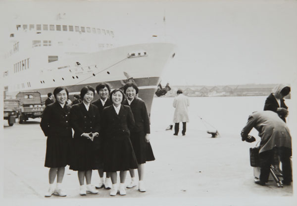 | Kobe Ferry Pier. Gelatin silver print, 1961, 6.1 x 8.8 cm, Tohru Funabashi Collection. Mrs. Funabashi, who is at the centre of the photo, poses with her classmates before their 1pm departure for Takamatsu during their graduation trip to Kagawa. They still look fresh despite a 7am start from Gifu that morning. The gentleman on the right wanted to take a photo with his wife but had suddenly realised he could not recall where they had put their boat tickets. Busy checking their purses and bags, they had begun to blame each other, fearing that this simple mistake could ruin their holiday. It would take an hour and a half for them to return to their home in Minotani, Kobe to search and then return to the pier. A day would be wasted... |