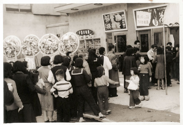 | Waiting at Endoji Cinema. Gelatin silver print, C.1950, 7.9 x 11.5 cm, Fujita Cosmetics Collection. Here people are waiting to enter the Endoji Cinema for a double feature, the American movie The Hard Way, and an older Japanese movie The Buried Treasure (Fuun Shogidani) starring Tsumasaburo Bando. In the photo there is a girl in a sailor suit with short hair who was a junior high student from the neighbourhood. The Kato family lived on the same street as her and their son was a movie director. She would occasionally talk with him when he came to visit his parents. She was fascinated by the world Mr. Kato described and her passion for the movies had grown. She thought that perhaps she would pursue a career as a lmmaker when she grew up. |