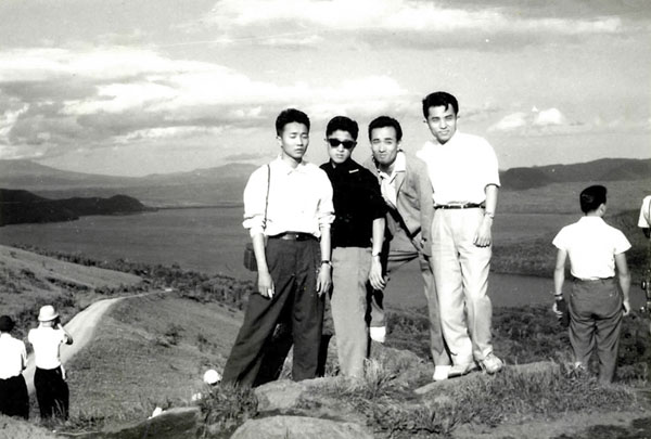 | Friends at Bihoro, Hokkaido. Gelatin silver print, c.1957, 5.6 x 8.3 cm, Tohru Funabashi Collection. Mr. Funabashi, first from the right, poses with his friends at Bihoro Pass during their summer holiday in the Ainu area. They came here especially for its famous, beautiful view. The young man at the right behind them however came for a different reason. He was a big fan of actress Keiko Kishi who had become famous for the movie series Your Name. He had seen all three parts of the series but was heartbroken when he learnt she was dating a French film director. He had decided to visit the locations where the films were shot to look for traces of his goddess. |
