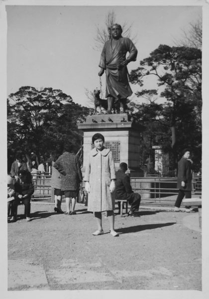 | Statue of Last Samurai, Ueno Park. Gelatin silver print, 1961, 9 x 6.3cm, Tohru Funabashi Collection. In this photo Tamiko, the future Mrs. Funabashi, stands in front of the Statue of Saigo Takamori, the “last true samurai” in Ueno Park during a visit to her brother who was studying at Waseda University in Tokyo. The man sitting behind Tamiko was an amateur historian from Kagoshima and was taking a rest after a long walk. He thought the representation of Takamori in this statue by Takamura Koun was a more genuine re ection of his love of traditional Japanese culture than the earlier painting by Tokonami Masayoshi which depicted him in a western uniform with an European dog instead of an Akita. |