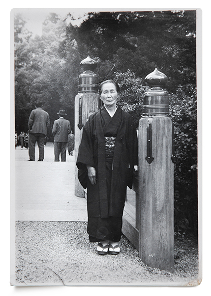 | Grandmother, Gelatin silver print, 1963, 8.2 × 11.7 cm, Keizou Moriguchi Collection Mr. Moriguchi’s grandmother once travelled with her husband to Ise in Mie Prefecture and in this photo she stands at the small bridge outside the Inner Shrine of the Ise Grand Shrine. This Shinto shrine is dedicated to the sun goddess Amaterasu who is regarded as the ancestor of the Emperors of Japan. The two gentlemen in the background of the picture are also tourists. The one with a hat liked reading, particularly legends and novels. He explained to his friend beside him how Amaterasu was born from the left eye of an earlier god, but his friend was uncertain how her direct descendants, the Emperors, were actually born and wanted to question him about this. |