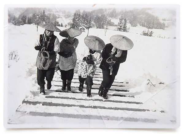 | Temporary Road for the Tsunan Elementary School, Gelatin silver print, 1960s, 9.1 x 6.5 cm, Keizou Moriguchi Collection In this photo Mr. Moriguchi’s mother walks with her neighbours on a temporary timbered road leading to the Tsunan Elementary School. In earlier days the men of Tsunan would go to work in the big cities during the winter and the women would remain at home and take care of daily life. This included such things as clearing snow, the general maintenance of the house and land, and looking after the elderly and children. These were not easy tasks. Walking with Mr. Moriguchi’s mother at the far right was a friend from her village. She was the toughest. Both her grandparents were sick and she had to spend a lot of time with them. Luckily her children were good and helpful and caused her no worry. Nevertheless she always dressed in plain, dark clothes as she felt her life was a heavy, colourless burden. |