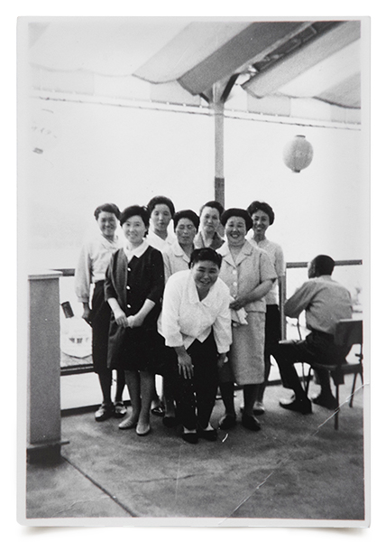 「長野県、野尻湖ふ頭にて」、ゼラチン・シルバー・プリント、1969 年、7.8 x 11.2 cm、森口敬造蔵 野尻湖のツアーに参加した森口さんの母(右端の女性)の隣には、見知らぬ男性が たまたまそこに座っていた。この男性は東京にある日本大学で長いあいだ事務員を しており、十分な給料をもらっていた。けれども前年、学生の抗議運動で大学キャ ンパスは無秩序状態になった。どうして彼らがあれほど憤りを感じていたのか、生 活水準だって悪いわけではないのにと、彼は理解できずにいた。彼の息子は早稲田 大学に合格して、そのことは家族にとってとても名誉なことだったのにもかかわら ず、彼もまた学生運動にのめり込んでいったのだった。そのせいで親子の間では口 論ばかりで、もううんざりしていた。キャンパスが学生に封鎖されてしまっている 間をいい機会だと考えて、彼は生まれ故郷である信濃の母を尋ねようと小旅行に出 た。毎日杖をついて一時間半ほど、心静かに湖畔を逍遥していたのだった。 |