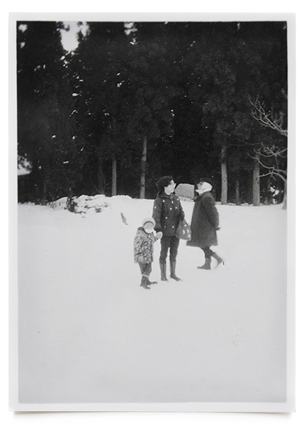 | A Skiing Day of the School, Gelatin silver print, c.1970, 6.5 × 9 cm, Kimi Nisizawa Collection This photo was taken at the Kameoka Ski Area adjacent to Tsunan. Mr. and Mrs. Nisizawa had taken a break from their busy fish shop and joined their son’s School Ski Day. The lady in the photo walking past Mrs. Nisizawa was from Kameoka Village. Her son, who just started going to primary school, had a passion for skiing. As his father was a ski instructor at the ski facility he often skipped school and came here as it was more fun. On this day there were many visitors; so she was finding it difficult to locate her son. |