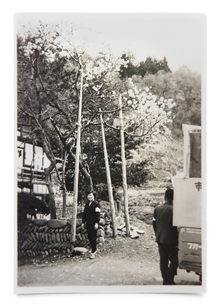 | Under a Blossoming Sakura Tree, Gelatin silver print, 1963, 6.5 × 9.2 cm, Hisakazu Ishizawa Collection In this photo Mr. Ishizawa’s mother stands under a blossoming sakura tree. She was a member of Shigeru Yaguchi’s campaign team when he contested a by-election for the City Council. Mr. Ishizawa‘s mother was 22 years old and she was responsible for addressing voters with the microphone on the campaign truck. This role was known as Uguisu, “nightingale or singing bird girl” in Japan. They were in the Honmachi-6 area, and the man standing next to the truck was a 40 to 50 year old farmer who had joined the campaign team. Back then farming was considered a low-value and low status occupation. Younger people moved to the city for an easier life and because of this the productivity of farms was severely affected. The farmer felt that Mr. Yaguchi was enthusiastic and helpful to farmers, so he had put aside his farm work and had come to join the campaign. |