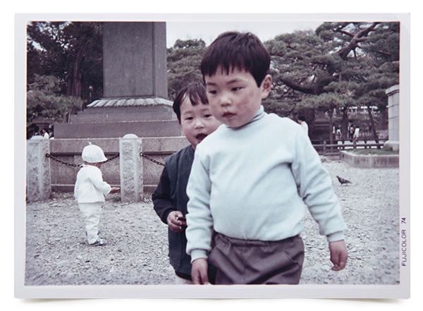 | Brothers, C-print, 1972, 11.4 x 8.3 cm, Hisakazu Ishizawa Collection When he was young Ishizawa went to visit the Zenkoji Temple in Nagano with his parents and his younger brother. The photo captures both of the brothers in front of the stone lantern outside the main hall. In the back there was a baby all in white walking unsteadily toward his father ( who is completely blocked by the Ishizawas’ ). This family were also tourists. The baby had just celebrated his first birthday, and in the last few months been watching the cartoon Lupin III with his dad. He smiled every time he saw the main character. Now his dad tried to tickle him with a Lupin comic and his mom, outside the frame of this photo, was getting ready with her camera. |