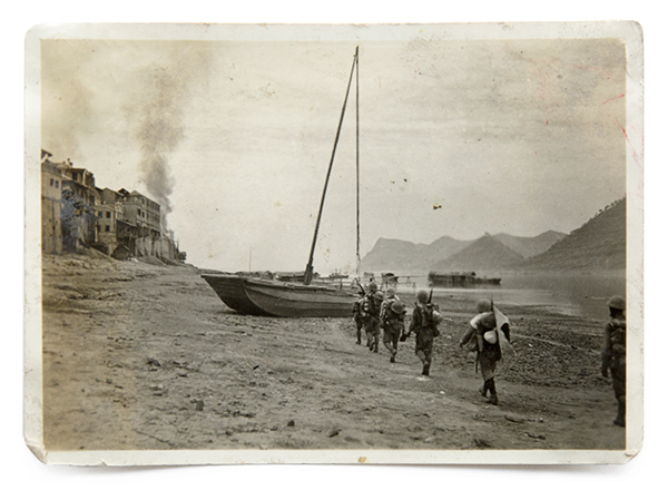 | Japan Ground Self-Defense Force, Gelatin silver print, 1955, 8.5 x 6 cm, Hisakazu Ishizawa Collection Japan demilitarized after World War II and it was not until 1954 that the Japan Self-Defense Forces (JGSDF) were formed. Mr. Ishizawa’s father caught a rare moment with his camera of soldiers training on a riverbank in Niigata Prefecture. The soldier carrying the national flag was a senior private and had never thought of becoming a soldier. In 1950 there was a recruitment drive for the National Police Reserve. At that time the lowest ranked policeman earned almost 50% more than that of the average labourer. He had immediately applied and was admitted. In the beginning he thought the job was to enforce law and order. Then the Korean War began and he was now afraid that they might be sent to fight. But it was a well-paid job and he had renewed his commission several times, and had seen the force transform firstly into the National Safety Forces and then the JGSDF. |