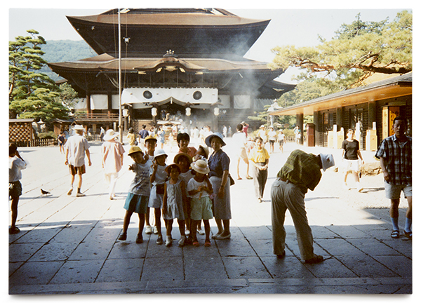 | 《善光寺家庭旅行》,彩色沖印照片,1990 年代,12.7 x 8.9 厘米,江村かおる藏 江村女士趁暑假和女兒帶同孫兒到善光寺參拜,在大殿前由江村的丈夫拍照留念,右 邊亦有位老先生為太太拍攝。他倆結婚三十年,先生過去多年在物業顧問公司上班, 工作時間超長,夫妻感情一度觸礁。但自從先生去年退休,他們多了時間相處修補關 係,一年四、五次旅行令人羨慕。太太個子矮小,看來比較年青,先生特別彎身以較 低角度,為要把她拍得漂亮和修長一點。 |