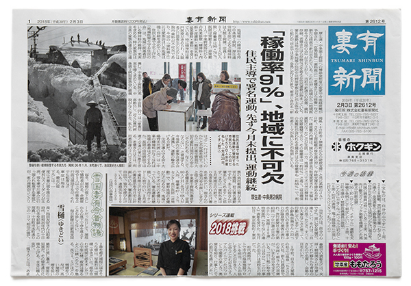 | 《妻有新聞》,頁1,2018年2月3日,39.4 x 27.1厘米 版面左上角有舊日新聞重溫,昭和 36 年一月降雪量特別高,接近去年的四倍,是當時 有紀錄以來最高的。相片攝於新潟市本町街區,站在最前面是此區的商販。因為連場 豪雪,商店街已有多天不能營業了。他從昨天起便與一眾區民義工架搭起數十米長的 「雪樋」,正忙於清走這一帶房頂上的積雪。這天有個外來記者為了採訪大雪下的失踪 事件而來,看到他們除雪的工作,就要求讓他拍攝。他只是感到奇怪,怎麼這樣平常 的事情也可以當新聞材料。 |