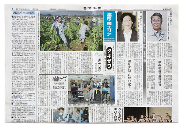 | Tsumari Shimbun, P.5, November 11, 2017, 39.4 × 27.1 cm This page is dedicated to news reports about Tsunan and Sakae. At the top is a report, with a photo, of some of the action during the Aiyoshi community harvest of nozawana, a popular local Japanese leafy vegetable. On the right of the photo is a woman in grey who is aged around 50. She had a part-time job in a supermarket during the week and worked in the morning. Because nozawana cost two-thirds of the market price at the harvest, and was also really delicious, she had decided to come with some co-workers. Although this was the era of Abenomics, the policy advocated by Prime Minister Abe to promote the economy of Japan, the benefits of the policy had yet to reach many of the people in the countryside. To make ends meet she had to find ways to cut her personal expenses. |