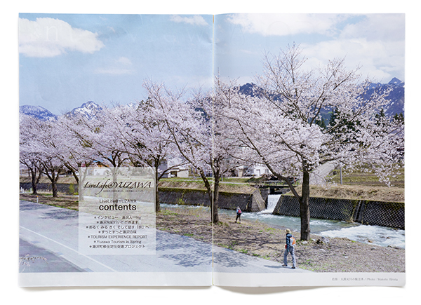 | VITA, No.44, p.2-3, March, 2018, 21 × 29.7 cm This free magazine promotes tourism in Echigo-Yuzawa. The cover photo is the Fifty Sixth Miss Komako, a beauty pageant named after the protagonist in the novel Snow Country by the Nobel Prize winner Yasunari Kawabata. This photo captures a scene of cherry-blossoms on the shores of the Daigenta River where a father and a son are hiking. The father was a computer programmer. His wife had passed away when the boy was still a toddler. He then began to work as a freelancer so he could have more time to look after his son. They had lived in Tokyo but had recently moved to his hometown in Niigata Prefecture. One reason for this was because of the high rents and the increasing cost of living in Tokyo. Another was that he felt his son needed a new environment as he had not got along with his classmates when he went to junior high school. Now the son had both the care of his grandparents and also the pleasure of being much closer to nature. |