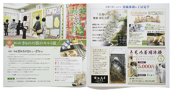 | Tokamachi Kimono Month 2018 Promotional Brochure, P.6, 2018, 20.9 × 20.9 cm As one of the programs for Kimono Month, there was the annual exhibition of quilt art in Tokamachi. The works shown were entries from all over Japan. The woman in the audience at the second from the right in the photo worked in the city government. For generations her family had been artisans who dyed and hand-drew kimono fabric. She had learnt these techniques when she was young, but eventually she chose to become a civil servant, and not a fabric artisan. In recent years she had become interested in quilt art, and that had reignited her passion for crafts. She was now thinking how she could include her knowledge of traditional kimono technique into the making of a quilt. |