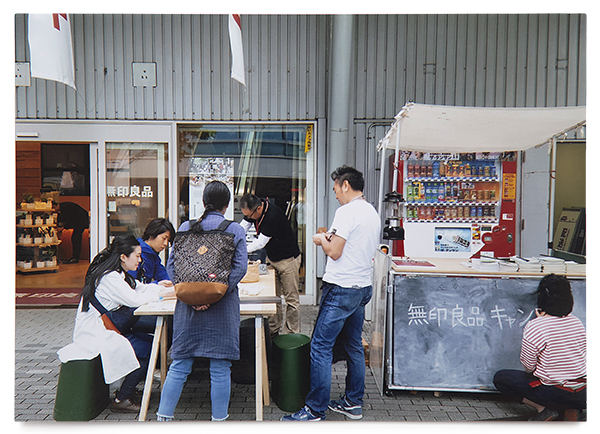 | Handicraft Booth, C-print, 2017, 17.8 × 12.7 cm, Yoshiaki Oshima Collection Mr. Oshima worked for the Muji Tsunan Camping Site. On this day they had set up a handicraft booth on a Tokyo street. The woman with her back to the camera was a tourist from Hong Kong who was visiting Japan. She had stopped to check out the booth and found that there were bundles of rope prepared for the handicraft workshop. Without much knowledge of the Japanese language she wondered if the booth was teaching the traditional skill of rope crocheting. Japanese rope crochet had become very popular after the release of the movie Your Name, and lots of girls were into the making of it. She would also like to make herself one as a souvenir. |