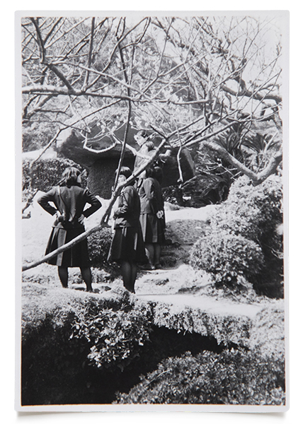 | Female Secondary School Students, Gelatin silver print, 1968, 7.7 × 11.2 cm, Yoshifumi Nakajima Collection After visiting the statue of Takamori Saigo, Mr. Nakajima’s father had returned to the tour bus with his colleagues. On the way he spotted a small group of female secondary school students under a plum tree. The one with her back to the camera was discussing issues with her friends around their post graduation plans. She was the eldest daughter of her family and had always been an independent spirit. She loved photography and was keen to further her studies in Tokyo and pursue a career like the journalist Saburou Kawamoto and the photographer Hiroshi Hamaya. However, her father believed that girls should simply further their studies in a specialised training college and then start working. If her mother had not helped to distract her father this morning she would not have been able to join the group. It probably would be the last outing with her friends before they all graduated. |