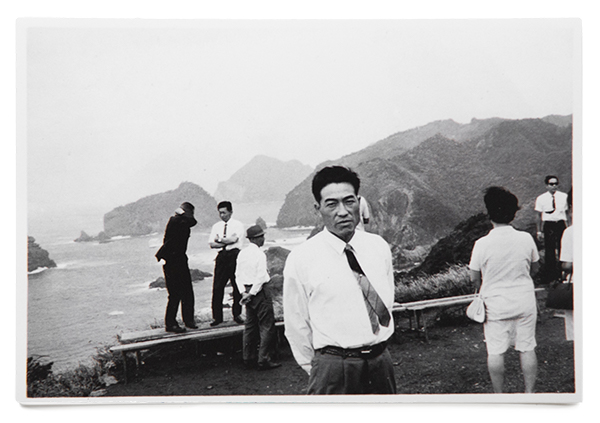 | Tour to Kagoshima, Gelatin silver print, 1968, 11.2 × 7.7 cm, Yoshifumi Nakajima Collection This is a photo of Mr. Nakajima’s father taken at a scenic spot in Kagoshima as part of a weeklong tour around Kyushu Island, Japan. It was March, and the weather seemed very warm to them as they came from further north. The gentleman dressed in black behind Mr. Nakajima Senior did not nd it overly warm as he was not a tourist but a resident of Kagoshima. He worked for a large distillery and was a member of the marketing staff. Their shochu was sold all over Japan, and traders visited them frequently to purchase it. Part of his job was to receive traders and other visitors. This morning he had given a tour of the distillery to a businessman from Hokkaido, who is next to him in the photo. After this he had taken him sightseeing and they had been to a variety of locations. They had had some interesting conversations and they had ranged over a number of topics. Just at this moment, and in front of this beautiful landscape, the gentleman in black had been asked, unexpectedly, about his love life. He felt somewhat embarrassed by the question and responded vaguely and hesitantly while rubbing his neck with his hand. |