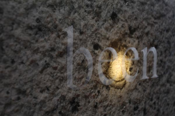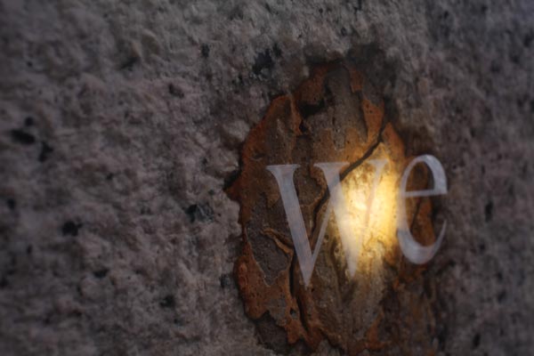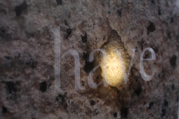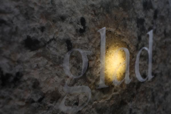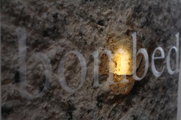 I’m glad we have been bombed, LED light, etched glass, C-Type print, dimensions variable (each element 30x40cm), 2010. Text in English, quote by Elizabeth, the Queen Mother on the bombing of Buckingham Palace, 1940