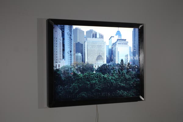 Aston Webb's Prophecy, light box with etched plexiglas, framed in steel, 125.5 x 100cm, 2011. Text taken from Aston Webb's London of the Future, 1921 in which he talks about having to "construct as well as destroy”?He would like to see a new city grow up on the south of the river, a city in which the gray streets should be opened up and the gloomy tenements swept away, in which light and air and beauty would be led into those parts of the city.” reported in The New York Times on Jan 26, 1913.