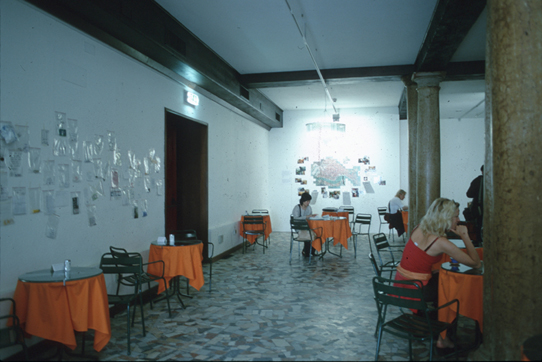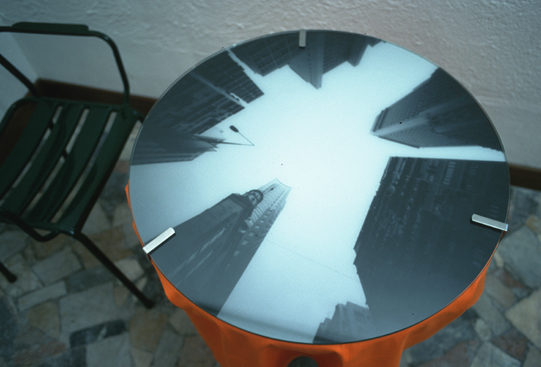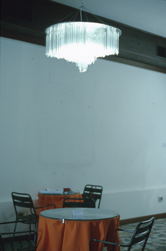 15 tables topped with images of urban skylines of both Hong Kong and Venice, chandelier, dimension variable, 2001 |