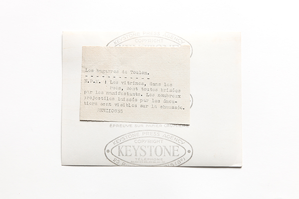 | Les bagarres de Toulon, Keystone Press Agency Paris, gelatin silver print, August 1935, 12 x 16 cm. Hit by the recession in the early 1930s, the French government’s economic measures to deal with financial crisis caused nationwide wage cuts, leading to a series of riots in Paris, Brest and Toulon in early August 1935. In this photo taken in Toulon, the southern port, shop windows on the street are all broken by protesters. The shortest one among the young men may not even be a teenager. No chance to go to school or work, he enjoys doing anything with his elder friends. Still pondering if he should grab something from the shop, he is already content with his own courage to smash the window. |