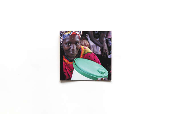 | Oxfam Unwrapped, leaflet, Oxfam GB, 2010, 12 x 12.5 cm. Violent conflicts between the rebel group Lord’s Resistance Army and the Ugandan government force have been lasting over 20 years in Northern Uganda. Many residents, known as Internally Displaced Persons (IDP), are forcibly moved into refugee camps not only for protection but more for distinguishing themselves from the rebel group. This photo inside the leaflet was taken at Mucwini camp around 2009. The young woman on the left foreground, an Acholi native in her mid-twenties from Kitgum, would have to trade sex for her basic necessities in the camp even with the so-called protection by the government, which is notoriously corrupted. Staring at these beautiful and brand-new jerry cans, she would not believe they are free. |