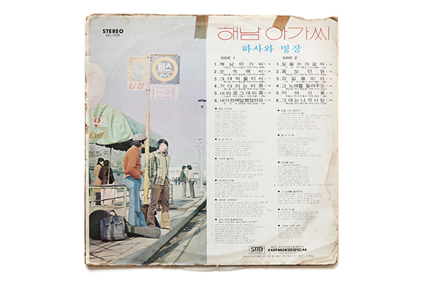 | Hasa and Byungjang, Haenam Lady (Korean), vinyl record album, Seoul: SRB Records, 1978, 31.4 x 31.2 cm. On the back cover of this album by Korean popular folk group Hasa and Byungjang (Sergeant and Corporal) we see the artistes posing at the bus stop. They are waiting and expressionless. There are also two men in the background, apparently waiting as well. They are facing each other but not speaking to each other. Both of them could be extras or even volunteers as they could be the staff of the record company. |