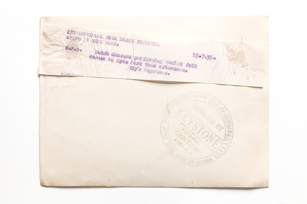 | 《國際土風舞蹈節在海德公園開幕》,Keystone 新聞社,銀鹽照片,1935 年 7 月15 日,15.2 x 20.3 厘米。 1935 年倫敦舉行的國際土風舞蹈節匯聚五百位來自歐洲各國的舞者。圖中可見荷蘭隊正在表演,站在中央跳起為隊友拍掌的男人,身材瘦削,本身可能是 一位真正的農夫,民俗舞都是由村民和家族相傳的。國家經濟低迷,他的生活也不好過 ;四十之年首次出國,他都不可想得太多了,也許此行亦是最後一 次到訪倫敦。 |