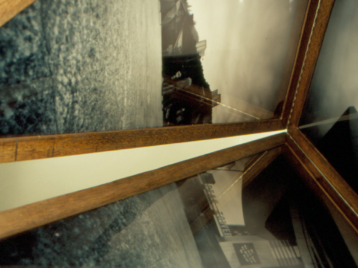 | Five pinhole photographs were taken at 5 views (4 directions and the sky) of the same site at the Victoria Peak of Hong Kong and were installed according to their exposing directions as a pyramid with a small opening. Audience could see the pictures inside with an electric torch provided. |